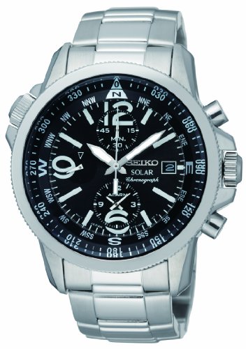Stainless steel case with a stainless steel bracelet. Fixed stainless steel bezel. Black dial with silver-tone hands and luminous index hour markers. Arabic numerals mark the 6, 9 and 12 o'clock positions. Minute markers. compass scale. 360 degree scale around the outer rim. Dial Type: Analog. Luminescent hands and markers. Date display at the 3 o'clock position. Chronograph - three sub-dials displaying: 60 second, 60 minute and 12 hour (alarm). Quartz movement. Scratch resistant Hardlex crystal. Textured steel crown. Solid case back. Case diameter: 41 mm. Case thickness: 13 mm. Round case shape. Band width: 29 mm. Deployment clasp. Water resistant at 100 meters / 330 feet. Functions: chronograph, compass, date, hour, minute, second. Casual watch style. Seiko Solar Chronograph Compass Black Dial Mens Watch SSC075.